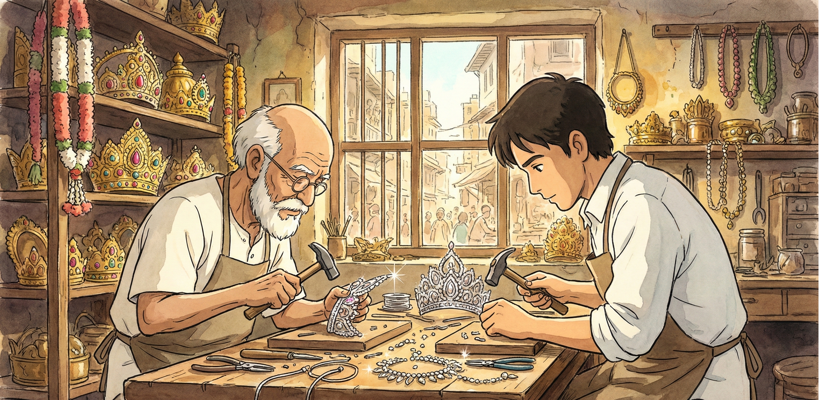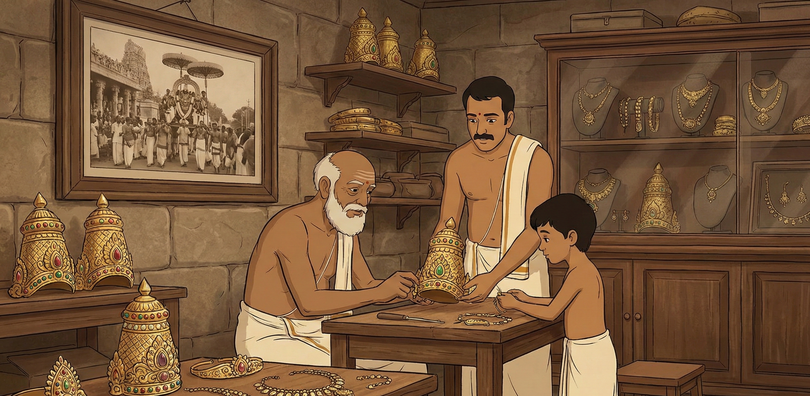Three generations of the same family have served temples, classical dancers, and brides across South India. We supplied deity alankaram to major temples and curated one of the largest private temple-jewellery collections.