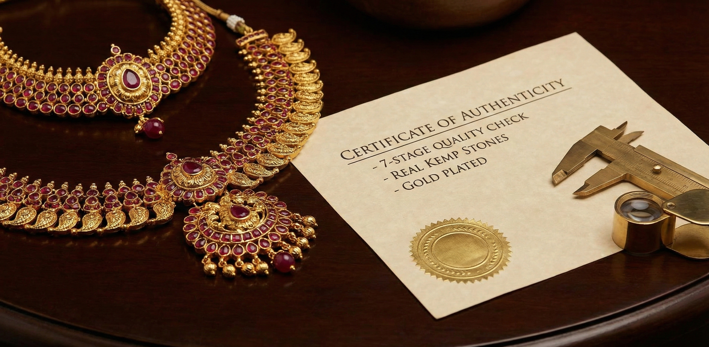 We use only the finest base metals with heavy gold plating (3–5 micron thickness), hand-selected real kemp stones. Every piece passes rigorous 7-stage quality checks and includes a signed certificate of authenticity.