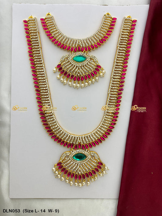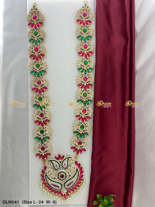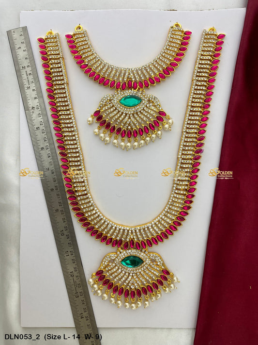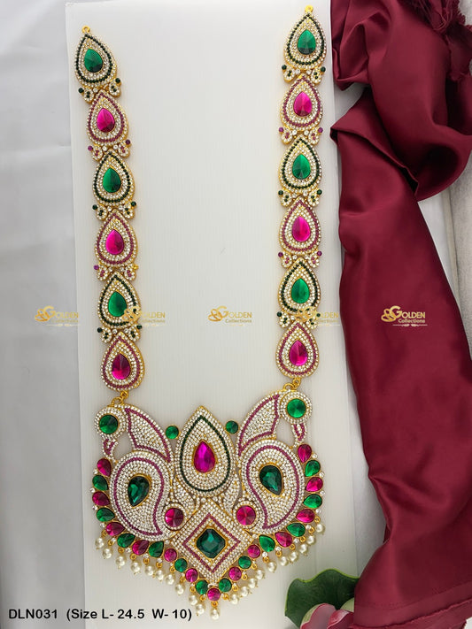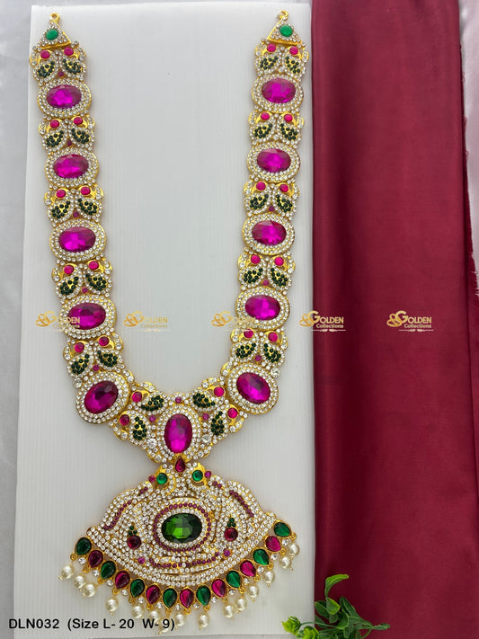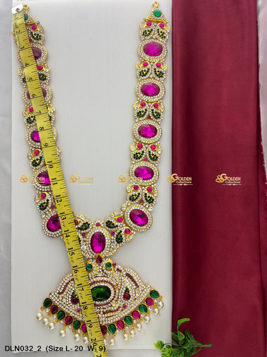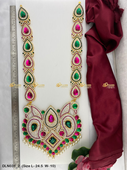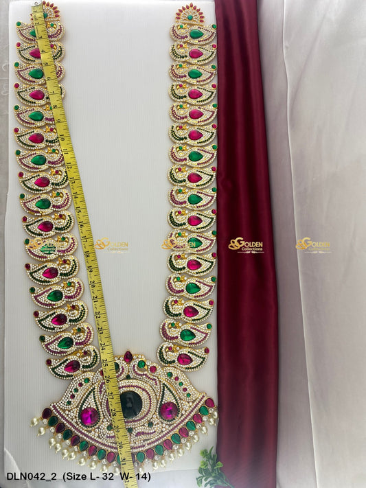Transform your temple or home altar with the divine elegance of GoldenCollections' Long Haram Necklace. Our gold-plated long haram necklaces are perfect for adorning Hindu idols, including Lakshmi, Saraswati, Durga and Amma, Amman and Ammavaru statues. Designed with spiritual devotion, each piece is meticulously handcrafted to enhance your puja rituals and deity worship.