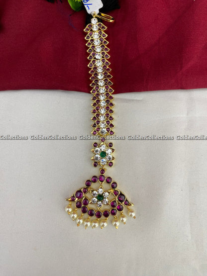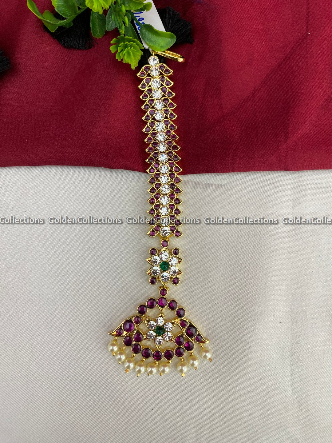 Enhance your Bharatanatyam ensemble with Kemp Nettichutti from Goldencollections. These accessories symbolize traditional beauty and craftsmanship, perfect for dance performances.