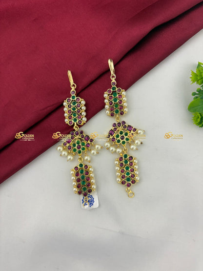 Kemp Mattal Ear Chain is a must-have accessory for Bharatanatyam dancers and brides who love traditional temple jewellery. Designed with elegant Kemp stones, this ear chain (also known as Matil or Mattal) enhances the beauty of your jhumkas and earrings, completing the perfect classical look.