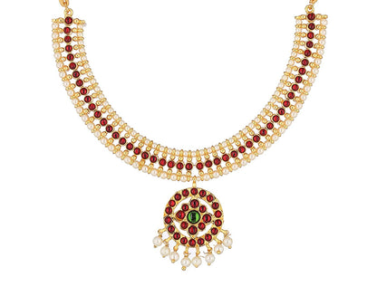 Radiate beauty and grace with this radiant Bharatanatyam short necklace. Adorned with shimmering stones and exquisite patterns, it adds a touch of glamour to your dance attire. Shine bright on the dance floor with this stunning piece of jewellery.