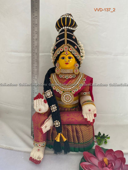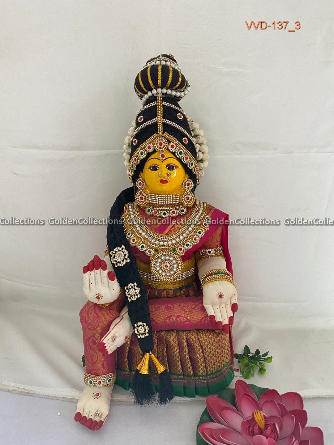 Celebrate Sravanamasam Pooja Vratham with our Varamahalakshmi idols from Goldencollections. Designed with intricate details and full jewelry, these idols are perfect for adding divine charm to your pooja rituals.
