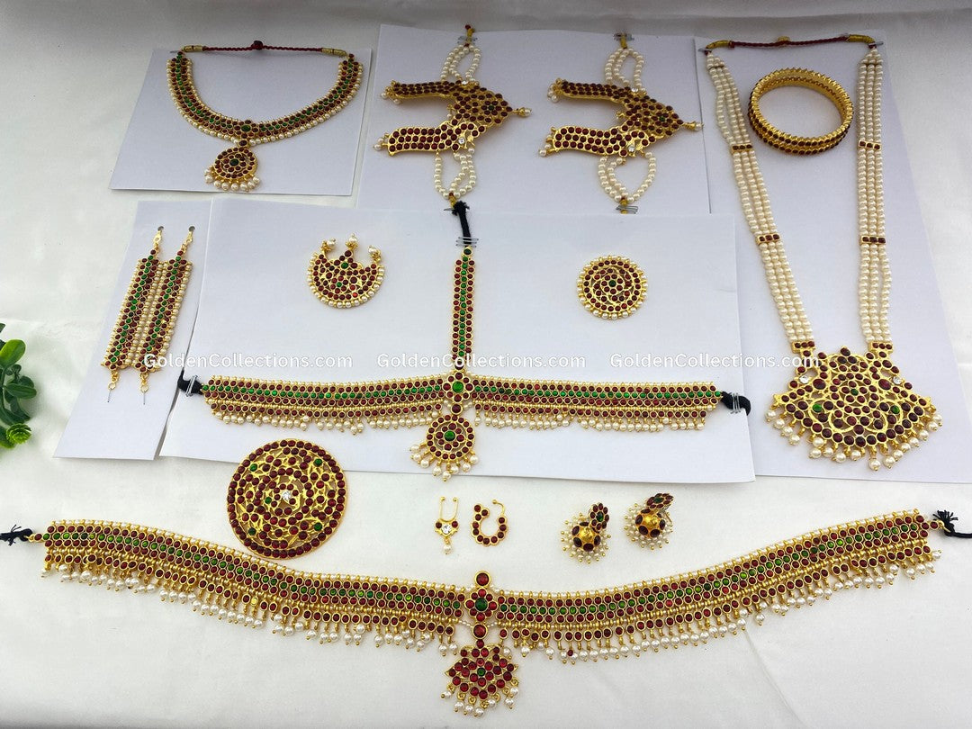 Elevate your dance performance with the Traditional Bharatanatyam Jewelry Set from GoldenCollections, an exquisite collection meticulously crafted for dancers of Bharatanatyam and Kuchipudi Dance Jewelry. This set features finely crafted pieces in a temple jewelry style, designed to enhance your grace and presence during every performance.