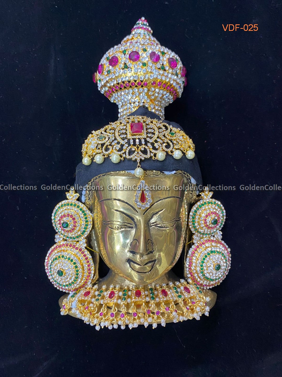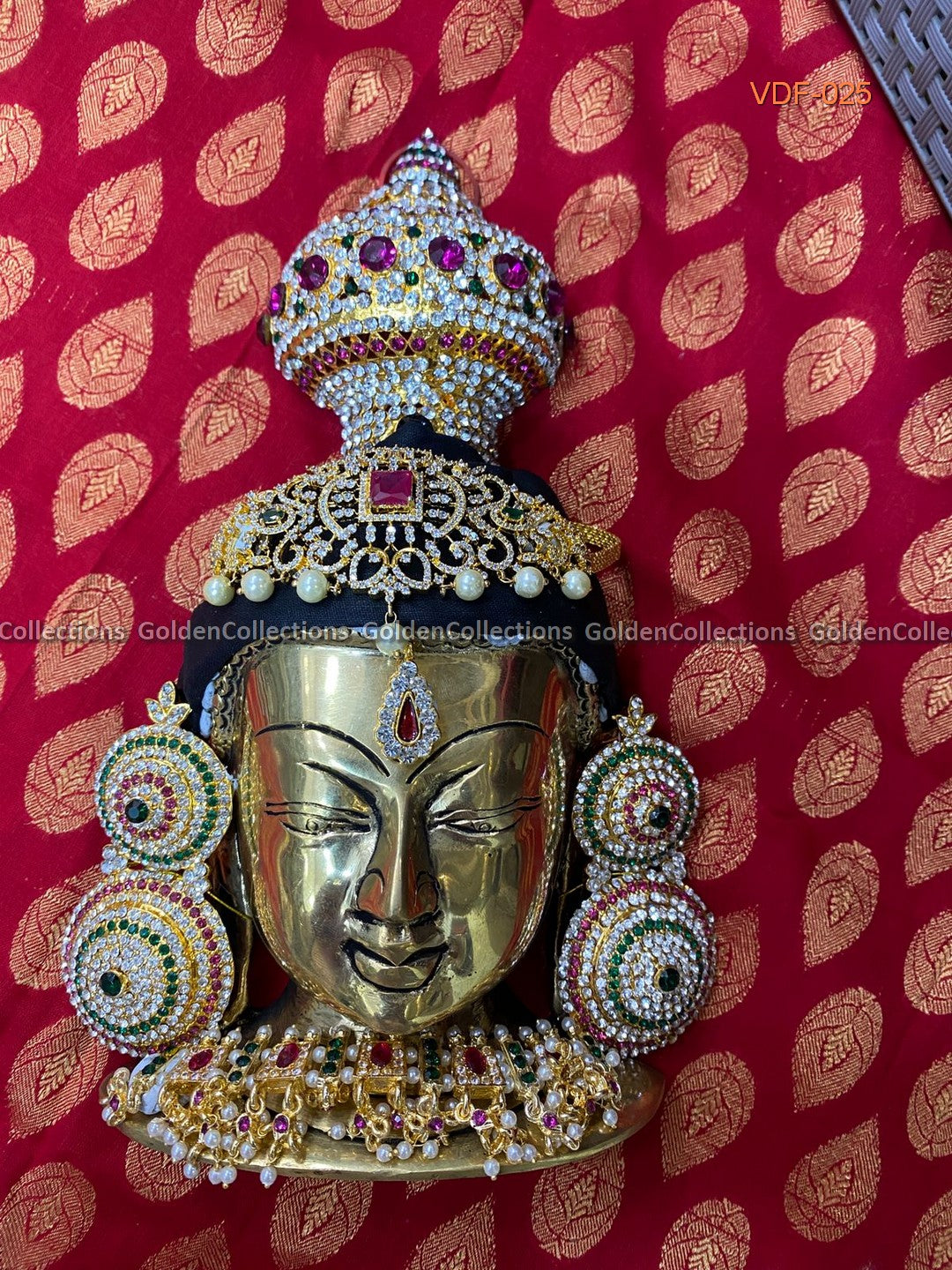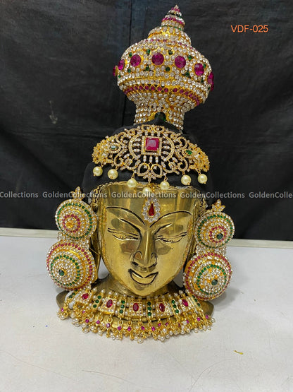 Transform your prayer space with the Varalakshmi Ammavari Brass Face - Stone Decorative for pooja from GoldenCollections. Crafted intricately in brass and adorned with stone Crown, Earrings, Short Necklace and Bindi. Purchase now to elevate your spiritual ambiance.